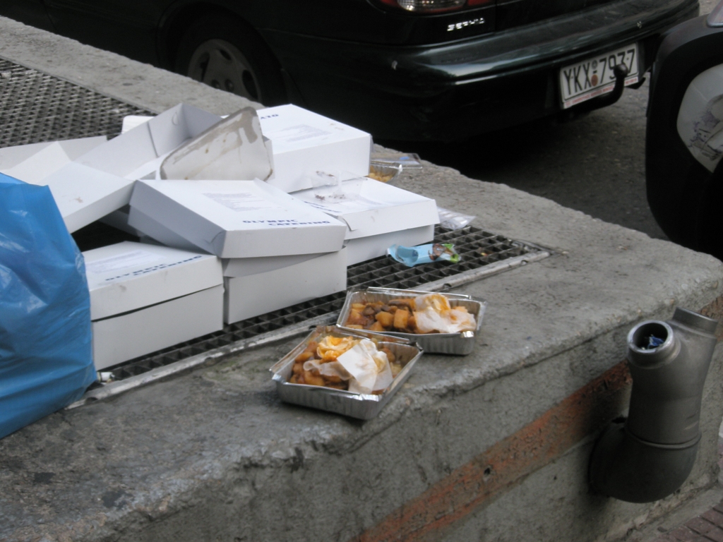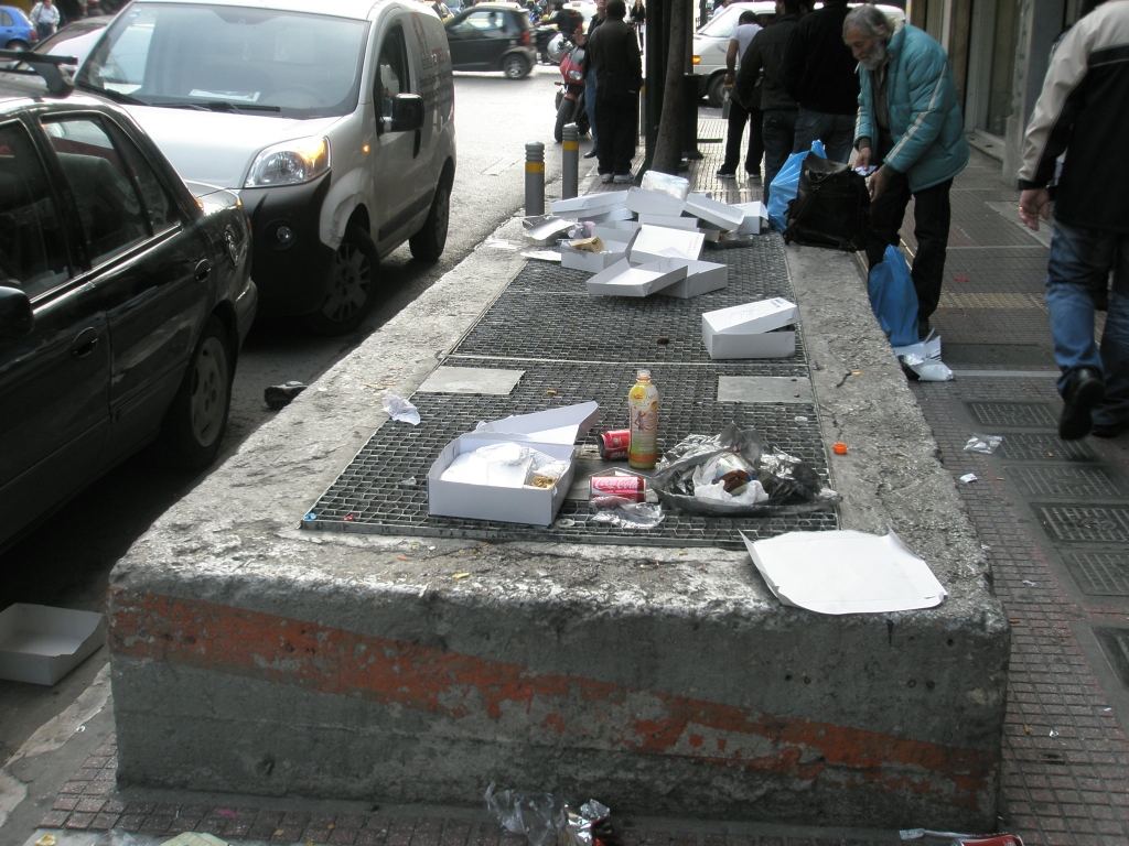 Когато излязох от сградата тълпата от чакащи беше намаляла, но все още имаше хора, които настояваха да получат порции. На решетката върху една от шахтите на метрото бяха оставени празните кутии от изконсумираната на място храна. До тях бяха оставени недокоснати две порции, а един старец държеше два сини плика и се опитваше да събере съдържанието им в един.
