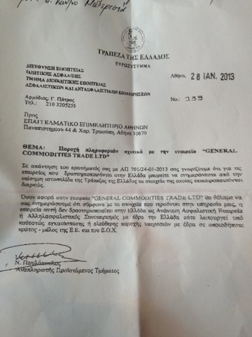 Единственият сигнал, който Асоциацията на гръцките застрахователни компании е получила за българска фирма, която действа на територията на Гърция без нужното разрешение е General Commodities Trade LTD. Банката на Гърция, която е надзорният орган на застрахователния пазар е изпратила уведомително писмо до асоциацията, в което се казва, че фирмата с горното название действа в страната без нужните разрешения. Константинос Берциас изпрати за потвърждение копие от предупредителното писмо от Банката на Гърция.
