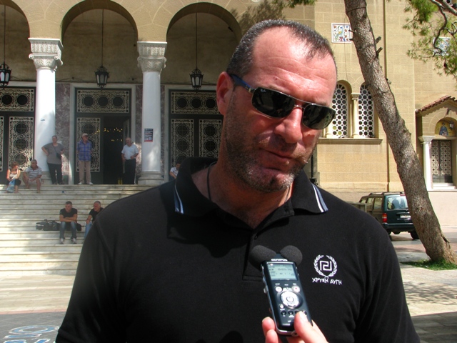 С депутата от Златна зора Николаос Михос разговаряхме по време на партийната акция за раздаване на хранителни продукти в района на църквата Свети Пантелеймон в центъра на Атина. Той не е от най-известните членове на парламентарната група на ксенофобската партия и беше облечен в черна фанелка и джинси, както всички други организирани нейни членове.