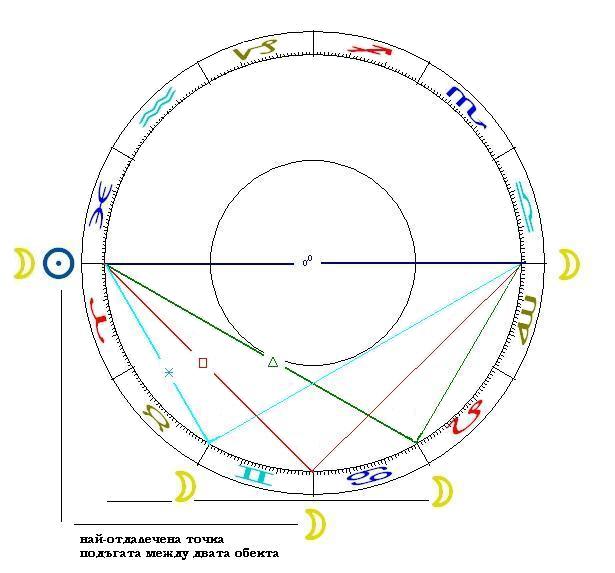 На нея са показани основните аспекти – секстил (60°, обозначен със звезда), квадрат (90°, обозначен с квадратче), тригон (120°, обозначен с триъгълник) и опозиция (180°)