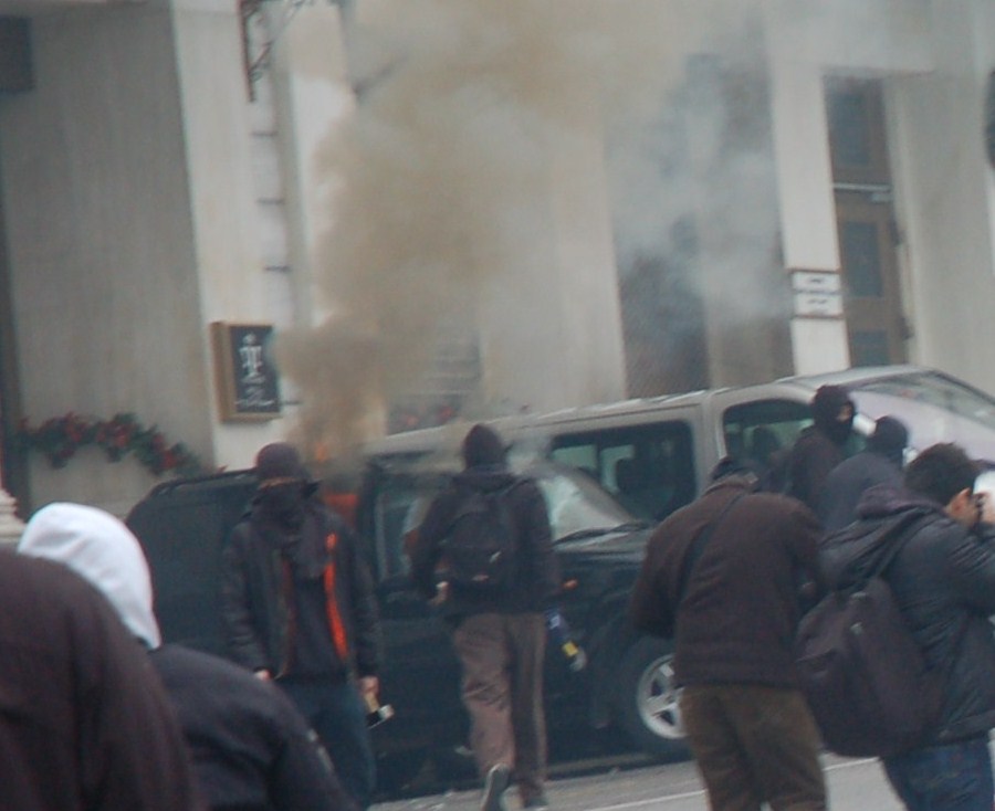 Анархисти разцепиха демонстрацията срещу закона за либерализиране на трудовия пазар и започнаха да хвърлят бомбички Молотоф на площад Синтагма. Сълзотворен газ хвърлят полицаите, а протестиращите заяочнаха да се оттеглят. Гоненица из целия център на града между полицаи и анархисти. В момента епизодите се развиват между булевардите Панепистимиу и Акадимияс.
