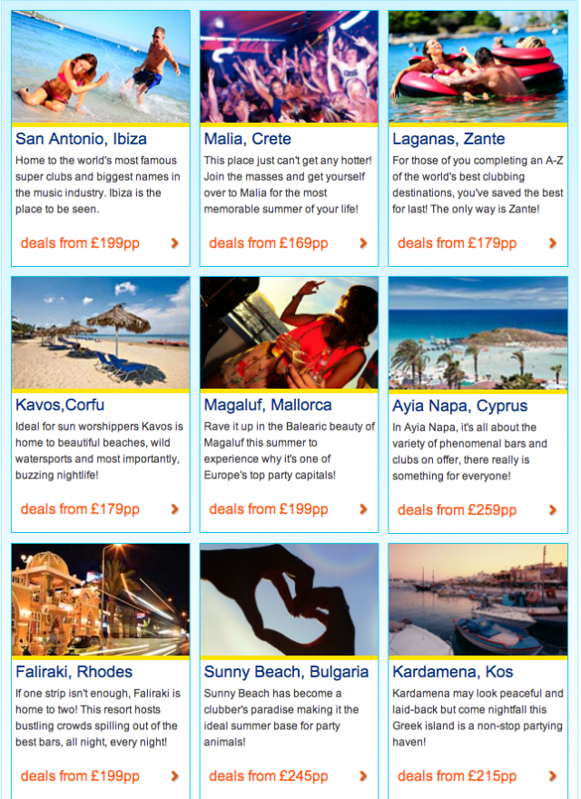 Един поглед в електронната страница на агенцията показва и останалите места в Европа, където британските младежи могат да прекарат бурните си ваканции срещу много ниски цени: Сан Антонио на остров Ибиза, Малия на остров Крит, Лаганас на остров Закинтос, Кавос на остров Корфу, Магалуф на остров Майорка, Агия Напа в Кипър, Фалираки на остров Родос, Слънчев бряг в България и Кардамена на остров Кос.