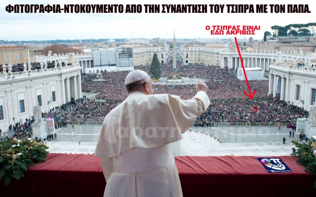 Надписът гласи: “Снимка-документ от срещата на Ципрас с папата”, а текстът над червеното кръгче: “Ципрас е точно тук”.