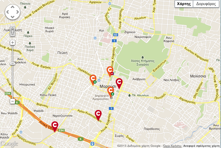 Освен до спирката на електричката, велосипеди има на площад Ироон, площад Агиас Лаврас, пред сградата на община Маруси, пред кино “Мимис Фотопулос” на улица Агиу Константину и на спирката на електричката “Нератзиотиса”.