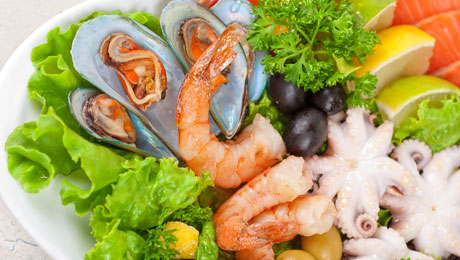 Морските дарове, като калмари, миди, октопод и скариди са богати на омега-3 наситени с мастни киселини полезни за сърцето, желязо, йод, витамини В-комплекс, фосфор и цинк. Те са достойни заместници на червеното месо, но по-здравословни. Калориите при тези храни зависят и от начина на приготвяне. Печени или варени калмарите, като и скаридите съдържат около 100 калории на порция. Октопод на скара има около 180 калории на порция, а печен омар съдържа по-малко от 100 калории. Голямата варени сепия има 250 калории на порция, 12 стриди със среден размер прибавят към диетата ни около 100 калории, четири сурови миди съдържат 30 калории.