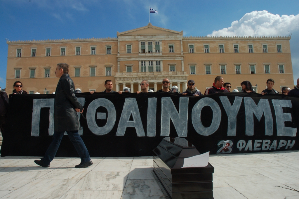 Безредици в центъра на Атина по време на протестното шествие, организирано от двата най-големи гръцки синдикати. Войната между полицията и анархистите, които разцепиха шествието се води на два фронта. Най-напред познатите "неизвестни лица", облечени в черни дрехи започнаха да хвърлят коктейли Молотоф по сградата на Министерството на финансите на Гърция на ъгъла на площад Синтагма и улица "Никис". Специалните части за борба с масовите безредици им отговориха със сълзотворен газ. В този момент друга група анархисти започна да хвърля коктейли Молотоф по сградата на гръцкия парламент около светофара при кръстовището на булевардите Василисис Софияс и Акадимияс. Един полицай от групата за бързо реагиране Делта пострада, тъй като демонстранти подпалиха мотоциклета му.
