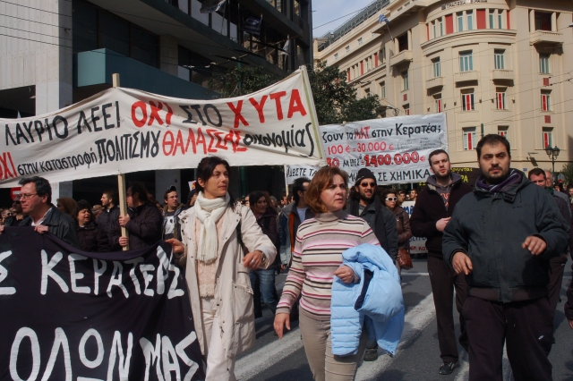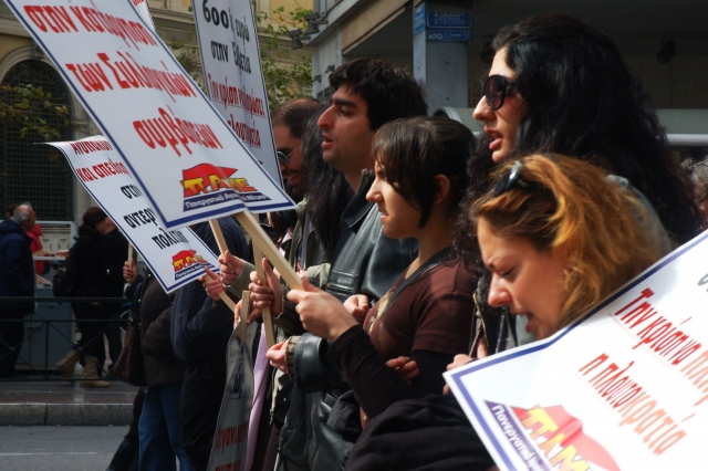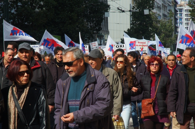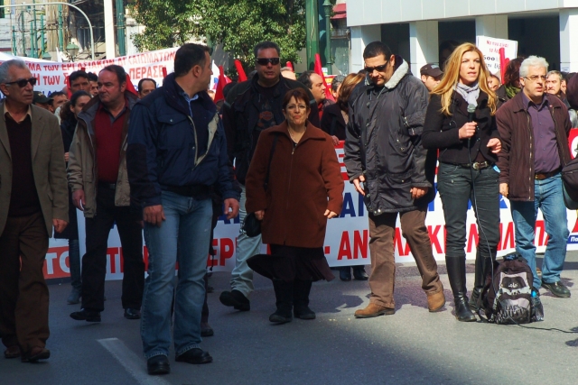 Служители в министерства, здравно-осигурителни каси, банки, супер-маркети, кораби, автобусен транспорт, търговци, режисьори, таксиджии, печатари, съюзи на жители от различни квартали на Атина и страната, работещи в самолетната индустрия, ученици, студенти, свободни предприемачи, журналисти, телевизионни техници, чужденци, учители и търговци участваха днес на големия митинг организиран от синдикатите на работещите в държавната и частната сфера, и от Комунистическата партия.