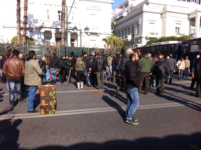 Веднага след това те се насочиха към страничния вход на парламента на булевард Василисис Софияс. Той бе блокиран от три полицейски автомобила, а отряди за борба с масовите безредици охраняваха тротоарите от двете страни и не позволяваха на никого да премине. Когато фермерите пристигнаха, някои от тях се опитаха да дадат на полицаите портокали, като им казваха, че се борят и за имотите на техните родители. Междувременно делегация, съставена от техни представители и депутата от СИРИЗА влязоха в парламента, за да предадат протестна нота.