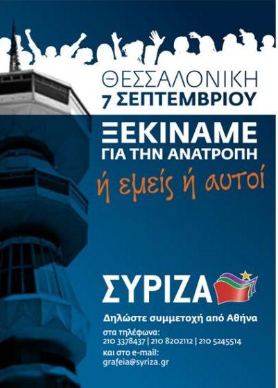 The main opposition party SYRIZA will actively participate in the protests. The Greek editions are critically commenting on the fact that Alexis Tsipras will take part in the protest during the opening of Thessaloniki Fair and that, a week later, he will be there again to give a press conference. The motto on the posters of SYRIZA, "Either them or us", which can be seen across the city shows the importance that the party is attaching to the protest.