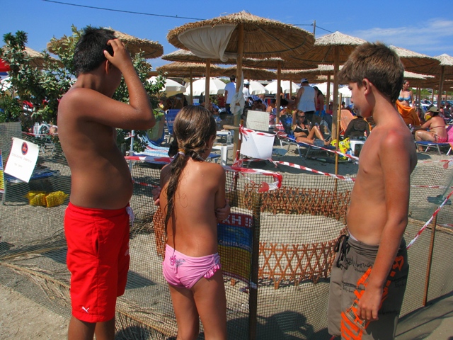 The emergence of the new visitor put all departments in the region in action. A fence has been immediately erected around the place where the turtle laid its eggs and port authorities in Rafina have put up warning signs. Members of the volunteer group, dealing with catastrophes in Artemis, guard the place every day. The owner of the restaurant has put reed on the place to protect the eggs from predators. And they are not few in number. A dog managed to dig up and eat two eggs on the first day, before the fence was erected around them.