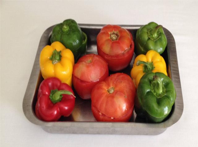 I like to use a variety of different coloured peppers, but traditionally green ones are used. You can also use large firm tomatoes, scooping out the insides, seeds and juice, and filling with the rice.