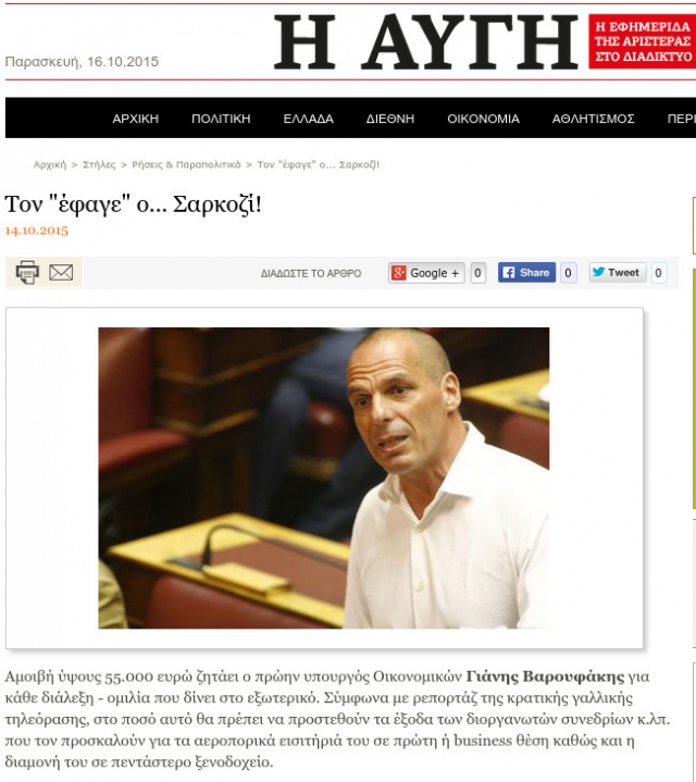 Meanwhile, Avgi published information citing a report of the French state television. It says that Yannis Varoufakis demands a €55,000 fee for any talk at an overseas event. And if should be topped up by the cost of air fare, a five-star hotel and other expenses associated with his stay.