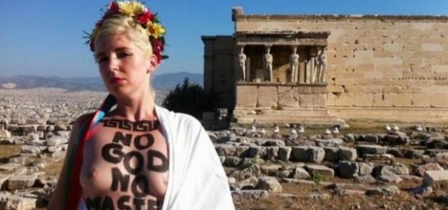 Feminist organization FEMEN reached the Acropolis too. "No god, no master" - with these words an activist of the organization posed in front of the Erechtheion temple on the sacred hill in the centre of Athens. She wears a wreath of flowers that was traditional for the first days of May in ancient Greece.
