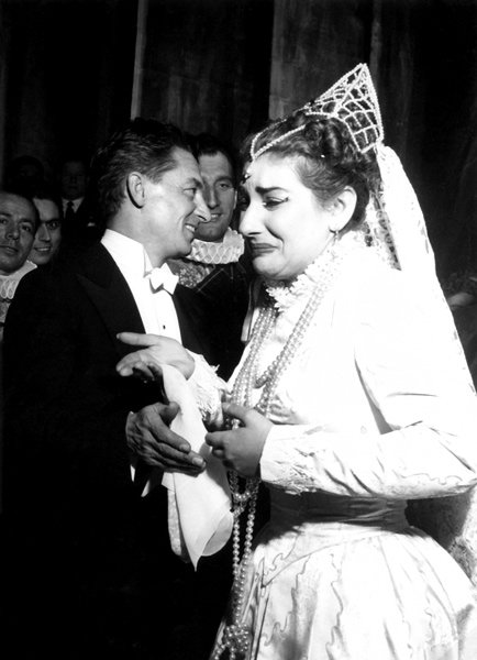 The almost unknown photograph from La Scala archives shows the Greek opera diva moved to tears by the incredible success of the opera when the curtain dropped in the middle of the performance and the apparently pleased young Herbert von Karajan.