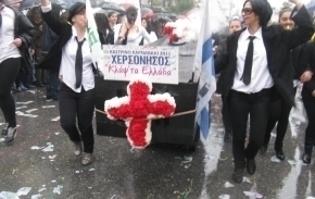 In line with the times new figures of the day have appeared among traditional characters of the carnival menagerie this year. The website of the traditional masquerade in Kozani reads the title ‘International Monetary Debauchery’. The carnival procession among the traditional architecture of stone-built houses in Dimitsana, Peloponnese presented the wedding ritual for prosperity ridiculing the troubled relations between the Greek rulers and the IMF representatives in the spectacle ‘The Marriage of 'Troika' and Our Beloved Greece’ (Ο γάμος του Τρόικα με την Ελλαδίτσα μας). Children disguised as European currency of zero coverage, holding "shields" with well-rounded zeros followed by the euro symbol on them, walked among the carnival characters in Heraklion as well as sluggish masquerade characters who have ingeniously devised the thematic slogan of the procession and were inserted in gift boxes with the inscription "Beware of IMF bearing gifts". They were followed by a funeral procession called ‘Mourning for Greece’ and the exaggerated reactions of inconsolable grief and bereavement coming from “widowed” men in drag wailing behind veils of black crêpe naturally provoked bursts of laughter.