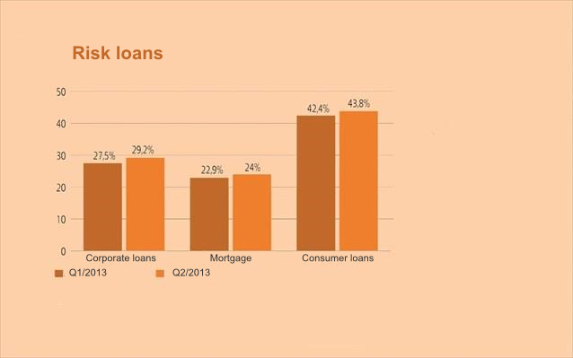 The banking system was loaded with about 12 billion euro of new "red" loans in 2013, in this way increasing the volume of risk loans to at least 67 billion euro. The Bank estimates that the indicator of delays was 31% in December, compared to 29.3% according to the latest official data for the second quarter.