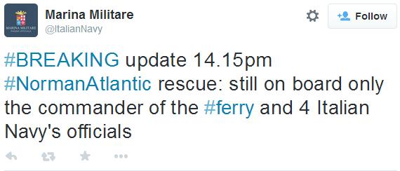 At 15:15 Greek time, the Italian Coast Guard reported that all passengers had been evacuated from the ferry in distress and that only the captain and four members of the Italian Navy were on board. An official announcement issued an hour earlier stated that 419 people had been rescued, including the five deceased persons. At present, the Italian authorities are preparing the lists of the evacuated passengers.