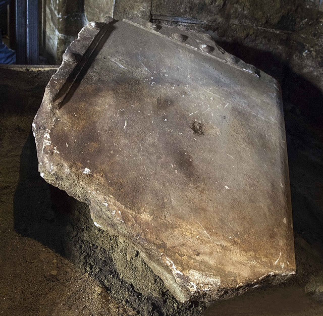 The other discovery by archaeologists is the northern part of the marble threshold with the following dimensions: length 2.15 m, width 1.6 m and thickness 0.25 m. It has supporting grooves for the metal rails that facilitated the movement of the marble door wings. The longitudinal section found there indicates that the floor of the room was covered with white limestone coating. Parts of limestone were discovered on the marble threshold too. According to archaeologists, the eastern part of the floor looks demolished, the western is damaged, and limestone pieces have fallen in the section.