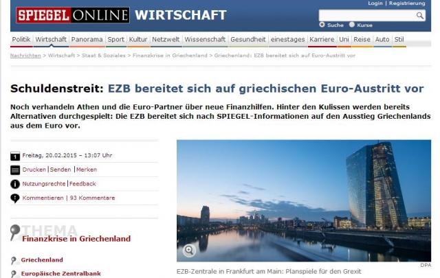В същото време германското издание Дер Шпигел съобщи, че Европейската централна банка се готви за излизане на Гърция от Еврозоната. Малко по-късно същата медия обяви, че според МВФ Еврозоната може да издържи едно такова сътресение.