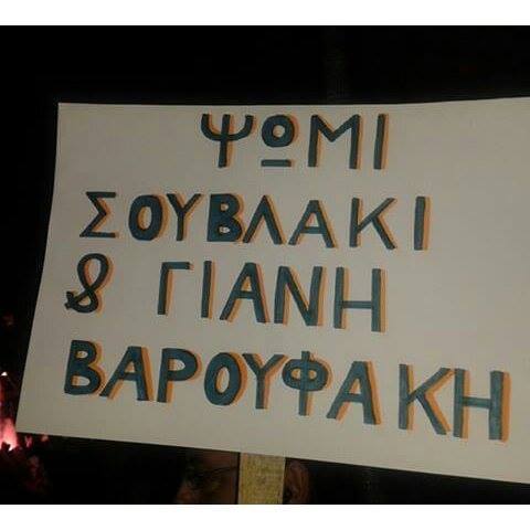 Възхищението им се изразява в плакати като този на снимката, който гласи: „Хляб, шишче и Янис Варуфакис”. Заслужава да се отбележи, че той е парафраза на популярния сред поддръжниците на краля Константинос 1-ви по време на Националната схизма (1914 – 1917) девиз: „Хляб, маслина и крал Константинос”. Смисълът на девиза бил, че предпочитат да гладуват, но да имат крал.